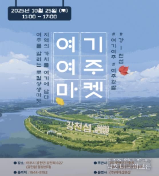 시민행정신문 기자 | 여주세종문화관광재단은 경기콘텐츠진흥원과 함께 10월 25일 강천섬에서 체험형 플리마켓 '2025 여기 여주 마켓'을 개최한다고 밝혔다. 이번 행사는 강천섬을 무대로 지역 로컬기업과 시민이 함께 즐길 수 있는 참여형 플리마켓으로 마련됐으며, 자연 속에서 다양한 체험과 소비가 어우러지는 로컬 축제로 운영된다.