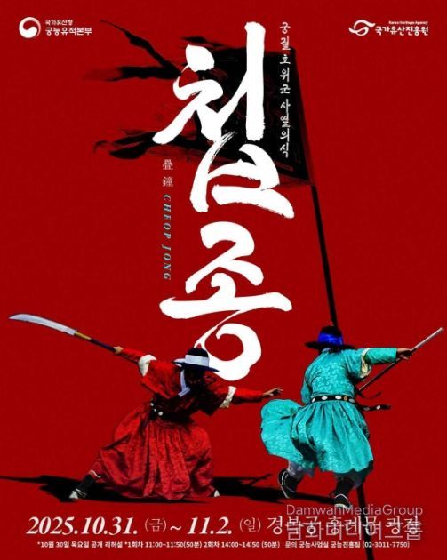 시민행정신문 이존영 기자 | 국가유산청 궁능유적본부는 국가유산진흥원과 함께 10월 31일부터 11월 2일까지 하루 2회(오전 11시, 오후 2시) 경복궁(서울 종로구) 흥례문 광장에서 '2025년 궁궐 호위군 사열의식 ‘첩종(疊鐘)’' 행사를 개최한다.