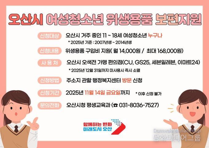 이번 사업은 오산시에 주민등록 또는 외국인등록·국내거소신고가 되어 있는 만 11세부터 18세까지(2007년생~2014년생)의 여성청소년이면 누구나 신청할 수 있다.