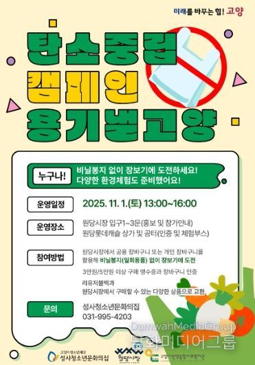 시민행정신문 기자 | 고양청소년재단 성사청소년문화의집은 오는 11월 1일 원당시장에서 청소년 주도의 온실가스 감축 실천활동 ‘용기 낼 고양’을 운영한다고 밝혔다.