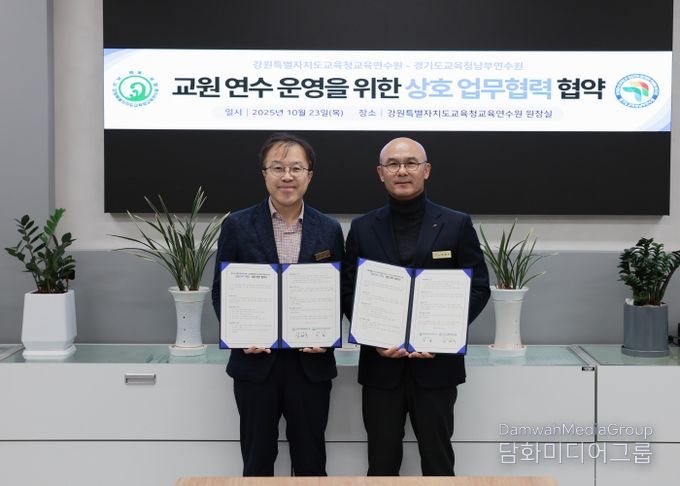 강원특별자치도교육청교육연수원에서 진행된 이번 업무협약에는 심한수 경기도교육청남부연수원장과 민섭 강원특별자치도교육청교육연수원장이 참석해 인적·물적 자원을 공유하여 연수 기획력과 실행력을 높이는 데 공동의 노력을 기울일 것을 약속했다.