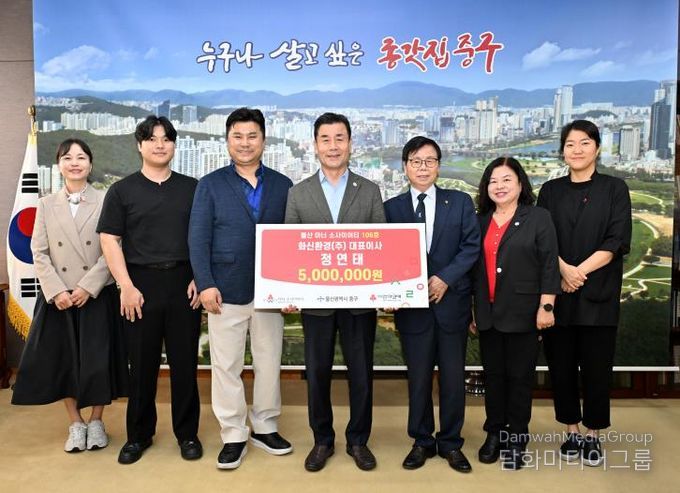 이번 전달식에는 김영길 중구청장과 정연태 화신환경㈜ 대표이사, 서선자 중구가족센터장, 이원경 울산사회복지공동모금회 경영관리팀장 등 6명이 참석했다.