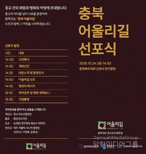충북도 관계자는 “이번 선포식이 종교 간 평화와 문화적 공존을 향한 새로운 출발점이 되길 기대한다”며, “도민 모두가 함께 걷고 소통하는 어울림의 길이 지속적으로 확산되길 바란다”고 밝혔다.