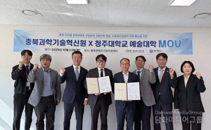 시민행정신문 이존영 기자 | 충북과학기술혁신원(원장 고근석)과 청주대학교 예술대학(학장 어일선, 이하 청주대)이 10월 23일 충북콘텐츠기업지원센터에서 콘텐츠 산업 유기적 협력체계 구축을 위한 업무협약(MOU)을 체결했다.