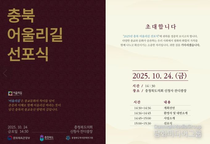 김영환 지사는 “오늘 선포식은 종교의 울타리를 넘어 새로운 화합의 길을 여는 뜻깊은 자리”라며, “어울리길이 앞으로도 도민의 일상 속에 자연스럽게 스며들고, 충북이 대한민국 종교 평화의 중심지로 우뚝 설 수 있도록 노력을 이어가겠다”고 밝혔다.