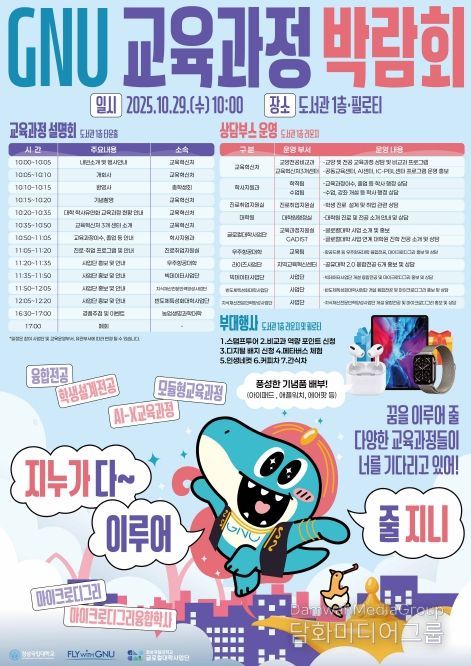 시민행정신문 강갑수 기자 | 경상국립대학교가 10월 29일 하루 동안 도서관 1층 필로티와 라운지에서 학생들의 전공 이수 다양성과 유연성 확보, 수강 선택권 확대를 홍보하기 위해 ‘2025학년도 GNU 교육과정 박람회’를 개최한다.