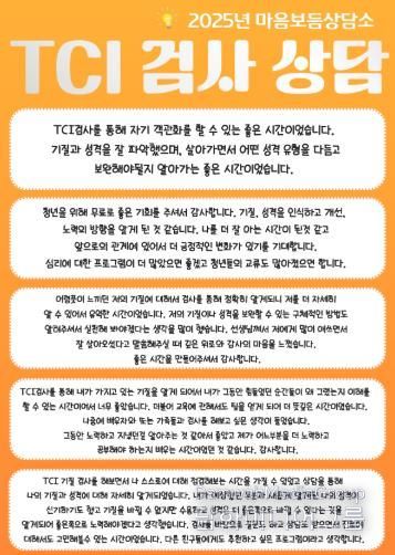 TCI 상담에 참여한 한 청년은 “검사를 통해 나를 객관적으로 바라볼 수 있었고, 기질은 타고나지만 성격은 변화할 수 있다는 점을 새롭게 깨달았다”며 “상담을 계기로 진로와 삶의 방향을 다시 생각하게 됐다”고 말했다.