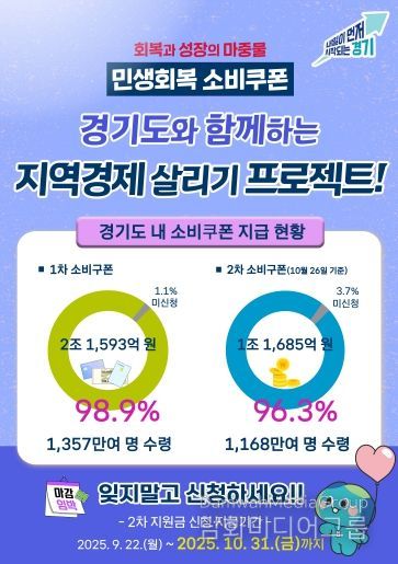 한편 경기도의 지난 1차 소비쿠폰의 지급률은 98.9%로 1,357만여 명이 소비쿠폰 2조 1,593억 원을 수령한 바 있으며, 26일 현재 1차와 2차를 거쳐 지급된 소비쿠폰(약 3조 3,275억 원)의 91.5%가 사용된 것으로 나타났다.