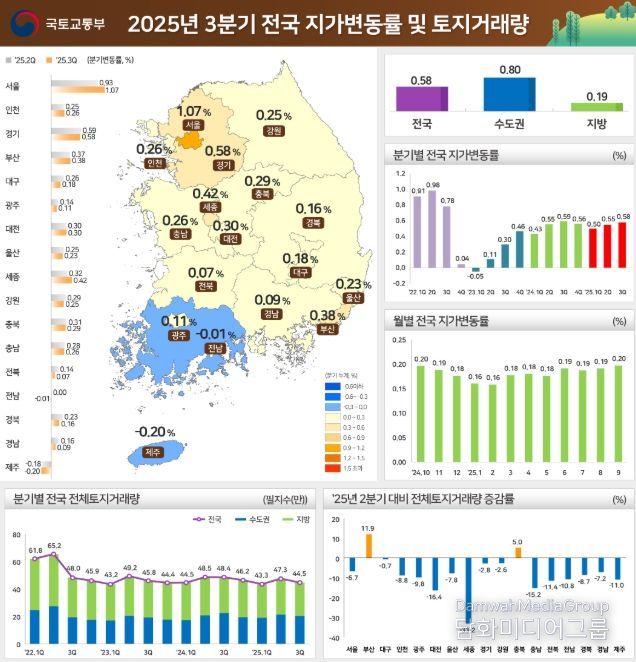 시민행정신문 이세훈 기자 | 국토교통부와 한국부동산원(원장 손태락)은 '25년 3분기 지가변동률 및 토지거래량을 발표했다.