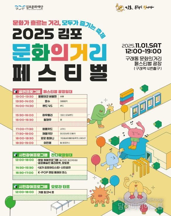 한편, '2025 김포 문화의거리 페스티벌'은 무료로 진행되며, 상세 일정은 김포문화재단 누리집 및 SNS 채널을 통해 확인할 수 있다.