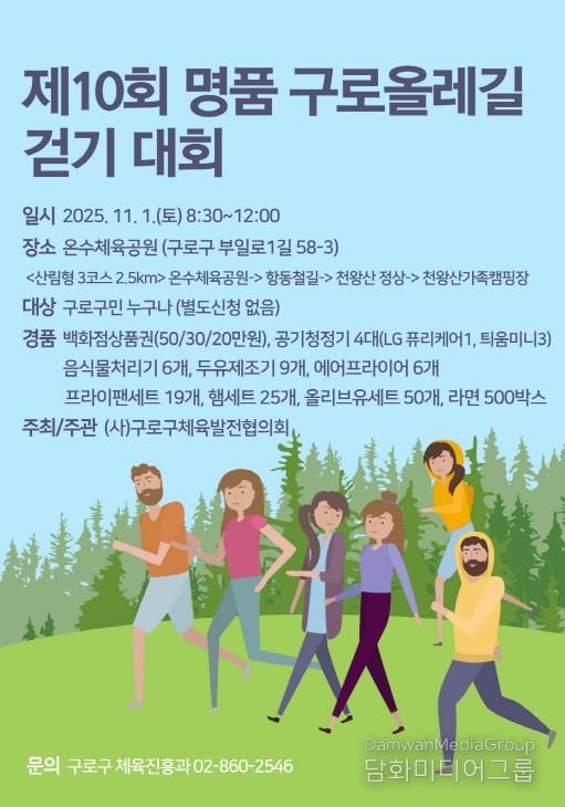 시민행정신문 이존영 기자 | 사단법인 구로구체육발전협의회가 주최, 주관하고 구로구가 후원하는 ‘제10회 명품 구로올레길 걷기 대회’가 11월 1일 오전 8시 30분 온수체육공원에서 개최된다.