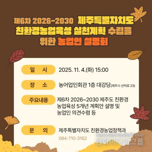 제주도는 11월 4일 오후 3시 제주농어업인회관 대강당에서 친환경농업인과 관련 단체를 대상으로 실천계획 설명회를 개최한다.