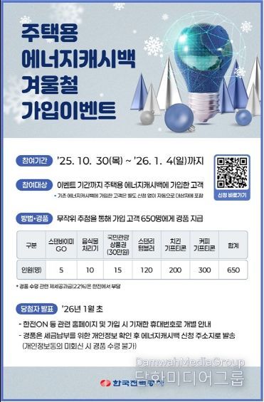한전 관계자는 “에너지캐시백 참여는 겨울철 전력 사용이 늘어나는 시기에 현명한 절전 실천 방법이 될 것”이라며, “더 많은 고객이 친환경 행동에 동참해 전기요금 부담을 줄이고 경품 혜택도 누리길 바란다”고 밝혔다.