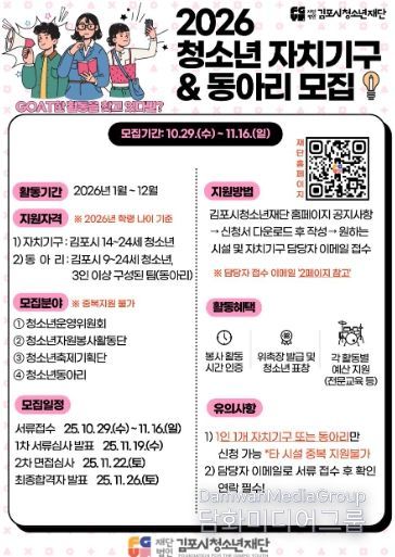 시민행정신문 강갑수 기자 | (재)김포시청소년재단에서 2026년 한 해 동안 김포시 청소년 수련시설을 함께 이끌어갈 청소년 자치기구 및 동아리 참여 청소년을 오는 10월 29일부터 11월 16일까지 모집한다.