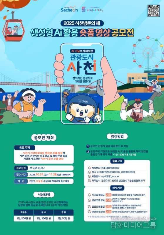 시민행정신문 강갑수 기자 | 사천시는 2025 사천방문의 해를 맞아 시의 관광자원과 관광 캐릭터에 대한 관심과 인지도를 제고하기 위한 생성형 AI 활용 숏폼 영상 공모전을 10월 31일부터 11월 28일까지 개최한다.