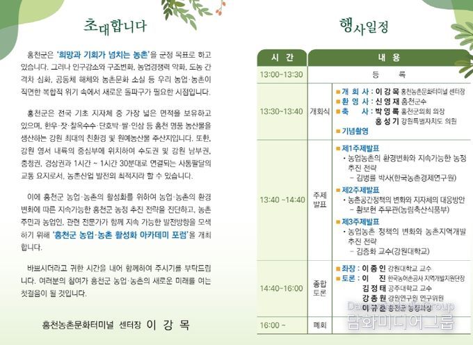 시민행정신문 강갑수 기자 | (사)홍천농촌지역관광사업단은 홍천군 시군 역량 강화사업의 일환으로 2025년 10월 31일(금) 오후 1시부터 홍천문화예술회관 2층 강당에서 '홍천군 농업·농촌 활성화 아카데미 포럼'을 개최한다.