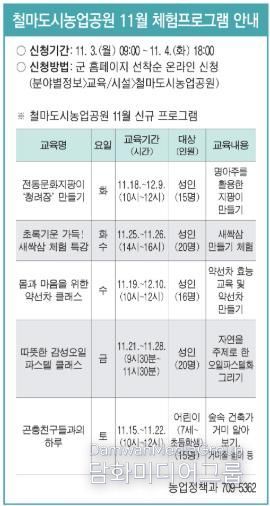 참여 신청은 오는 11월 3일 오전 9시부터 11월 4일 오후 6시까지 기장군 홈페이지(분야별 정보 ' 교육/시설 ' 철마도시농업공원)를 통해 온라인으로 신청 가능하며, 대상자는 선착순으로 선정된다.