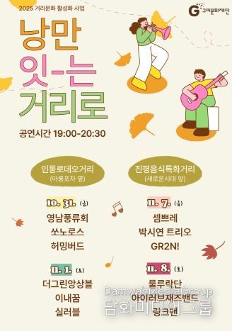 마지막 네 번째 공연(11월 8일·토, 진평음식특화거리)은 ‘룰루락단’이 플루트·첼로·피아노·드럼의 조화로 클래식과 대중음악을 잇는 감성적인 무대를 펼친다. 이어 ‘아이러브재즈밴드’가 세련된 재즈 선율로 무대를 완성하고 ‘링크맨’이 보컬과 기타 사운드로 따뜻한 무드를 전하며 ‘낭만 잇-는 거리로’의 여정을 마무리한다. 이번 공연은 도심 속 거리와 음악이 어우러지는 열린 무대로 시민과 예술가가 함께 호흡하는 문화 현장이 될 것으로 기대된다.