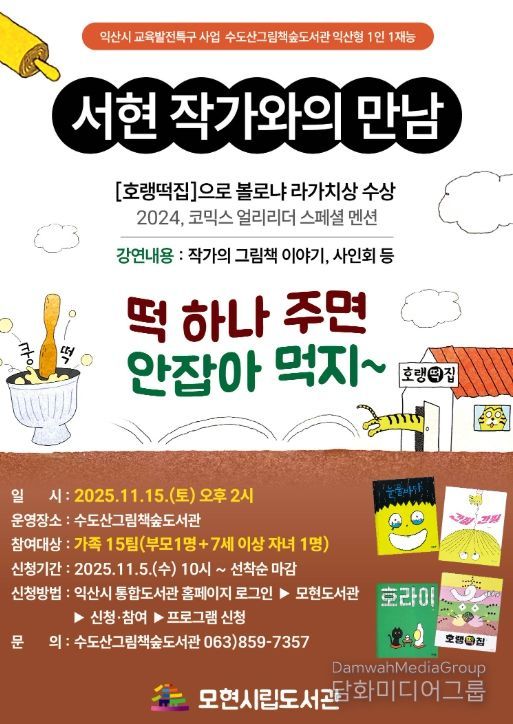 익산시는 수도산그림책숲도서관에서 오는 11월 15일 교육발전특구사업의 일환으로 '서현 작가와의 만남' 강연 프로그램을 운영한다고 31일 밝혔다.