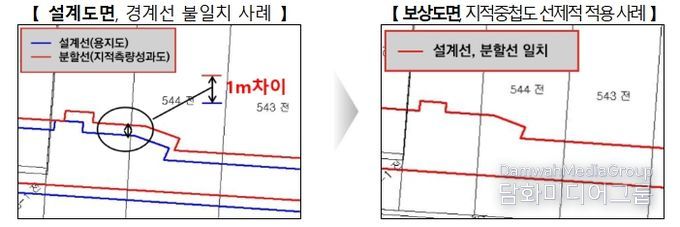 설계도면과 보상도면 간 경계선 차이의 선제적 해소를 위해 실시설계 단계에서 지적중첩도 작성과 선지정 지적현황측량을 실시한다.