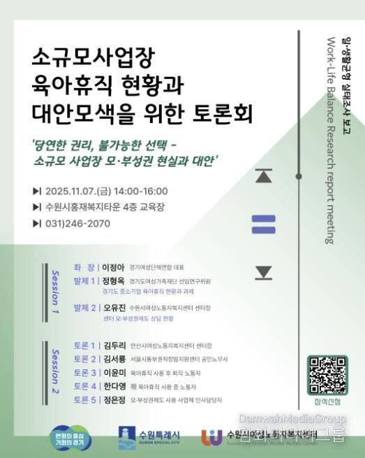시민행정신문 강갑수 기자 | 수원시여성노동자복지센터가 11월 7일 오후 2시 수원시홍재복지타운 4층 교육장에서 열리는 ‘소규모 사업장 육아휴직 현황과 대안 모색을 위한 토론회’ 참가자를 모집한다.