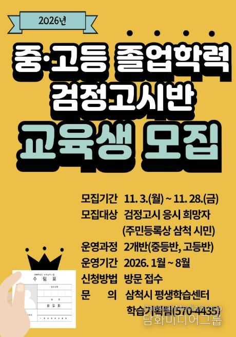 시민행정신문 강갑수 기자 | 삼척시가 학력 미취득 시민들의 학습 기회를 확대하기 위해 2026년도 중·고등 졸업학력 검정고시반을 운영한다.
