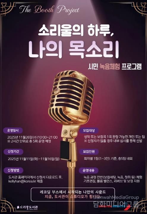 이번 프로그램은 시민들이 전문 장비와 시스템을 갖춘 소리울도서관 레코딩 부스에서 보컬 세팅, 녹음, 청취 등 전 과정을 직접 경험하며 자신의 목소리로 한 곡을 완성해보는 체험형 프로젝트다. 참가자는 녹음 후 기초 편집, 볼륨 밸런스, 리버브 등 간단한 후반 작업도 지원받을 수 있다.
