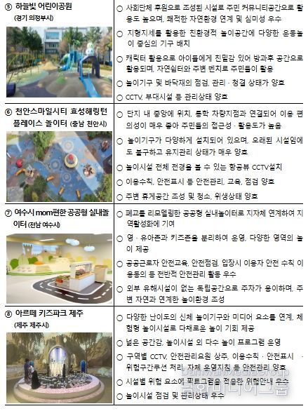 이번에 선정된 우수 어린이놀이시설은 2028년까지(인증 유효기간 3년) 매년 시설 관리상태, 안전사고 발생 여부, 안전 관련 법규 위반 여부 등을 점검한다.