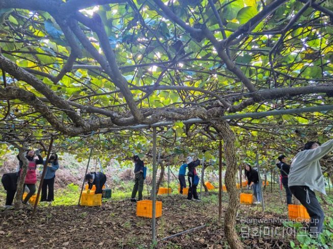 이날 오후 1시 30분부터 5시 30분까지 참다래 수확과 운반, 주변 환경 정비 등 다양한 작업에 참여하며 구슬땀을 흘렸다.
