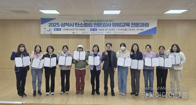 시민행정신문 강갑수 기자 | 삼척시탄소중립지원센터는 11월 3일 오후 7시 강원대학교 삼척캠퍼스 그린에너지연구관에서 ‘2025 삼척시 탄소중립 전문강사 양성교육 전문과정’ 수료식을 개최했다.