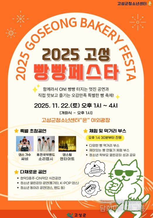 시민행정신문 강갑수 기자 | 고성군은 오는 11월 22일 토요일 오후 1시부터 4시까지 고성군청소년센터“온” 야외마당에서 2025년 제3회 고성군청소년어울림마당으로 ‘2025 고성 빵빵페스타’를 개최한다.