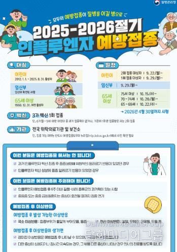 접종 대상자는 6개월~13세 어린이(2012.1.1.~2025.8.31. 출생자), 임신부와 65세 이상 어르신(1960.12.31. 이전 출생자)이며, 65세 이상 어르신은 독감과 코로나19 백신이 동시에 접종 가능하다.
