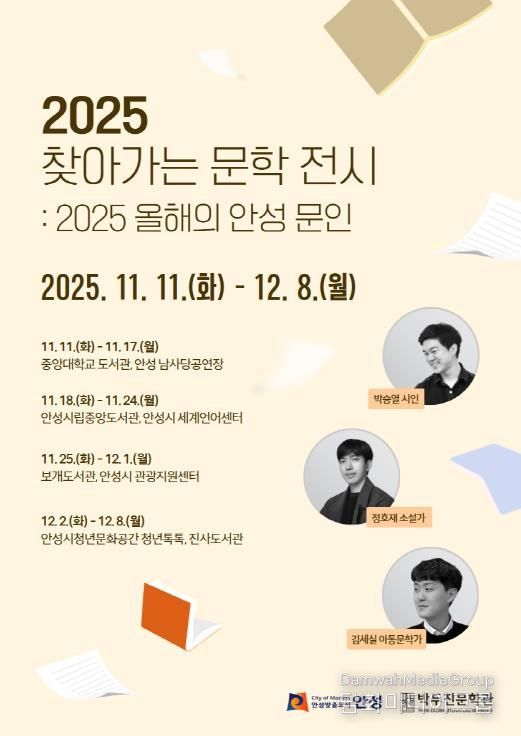 이번 '찾아가는 문학 전시'는 안성 문학 진흥사업 선정 ‘2025 올해의 안성 문인’을 홍보하기 위해 진행되는 관내 기관 순회전시이다. 전시 현장에는 이동식 전시 패널과 문학 퀴즈 부스가 설치되며, 시민 누구나 자유롭게 관람할 수 있다. 예정된 전시 일정 및 장소는 ▲중앙대학교 도서관・안성 남사당공연장(11.11.~11.17.) ▲안성시립중앙도서관・안성시 세계언어센터(11.18.~11.24.) ▲보개도서관・안성시관광지원센터(11.25.~12.01.) ▲안성시청년문화공간 청년톡톡・진사도서관(12.02.~12.08.) 순이다.