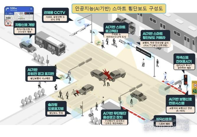 AI 기반 스마트 횡단보도는 보행자의 움직임과 차량 접근을 실시간으로 감지하는 센서와 카메라를 통해 교통량·보행량 정보를 실시간으로 수집·분석한다.