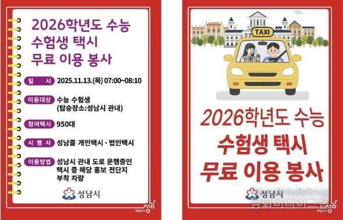 개인택시와 법인택시 총 950여 대가 오전 7시부터 8시까지 ‘2026학년도 수능 수험생 택시 무료 이용 봉사’ 표지를 부착하고, 수험생을 대상으로 시험장까지 무료 운행 서비스를 제공한다. 수험생은 성남콜택시(031-755-4000)를 통해 택시를 호출하면 시험장까지 무료로 이동할 수 있다.