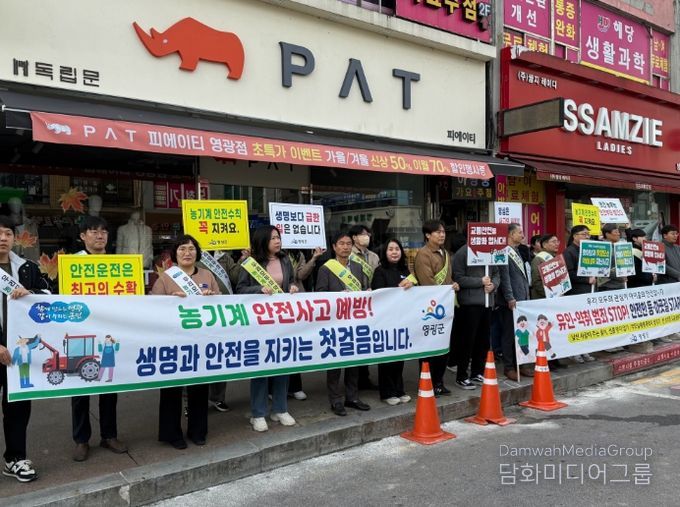이번 캠페인은 ‘농기계는 천천히, 안전은 빠르게’라는 주제 아래 11월 11일 영광읍 터미널시장 일원에서 실시했으며, 농업인과 주민 300여 명을 대상으로 농기계 안전운전 수칙, 교통안전 요령, 농기계 종합보험 가입 안내 등 실질적인 홍보 활동을 펼쳤다.