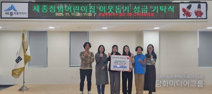 시민행정신문 강갑수 기자 | 세종특별자치시 금남면 세종정희어린이집(원장 박수진)이 11일 금남면지역사회보장협의체(공동위원장 이선영·박종설·이한월)에 이웃돕기 성금 104만 원을 전달했다.