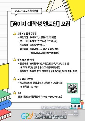 시민행정신문 강갑수 기자 | (재)군포시청소년재단 군포시진로교육협력센터는 청소년 진로탐색 프로그램인 '꿈이지 대학생 멘토단'의 멘토를 모집한다.