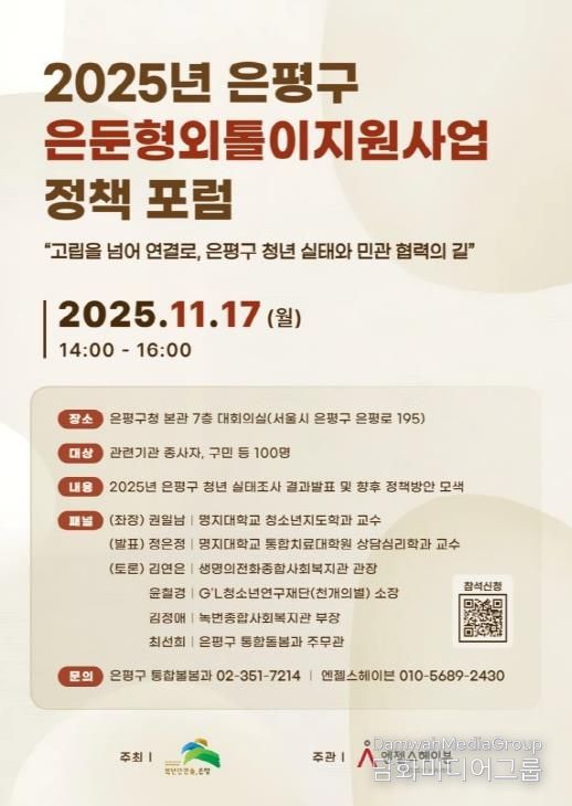 시민행정신문 강갑수 기자 | 서울 은평구는 외로움과 고립 위험에 취약한 청년층을 대상으로 민관이 협력할 방안을 모색하고자 오는 17일 ‘고립·은둔 정책포럼’을 추진한다고 밝혔다.