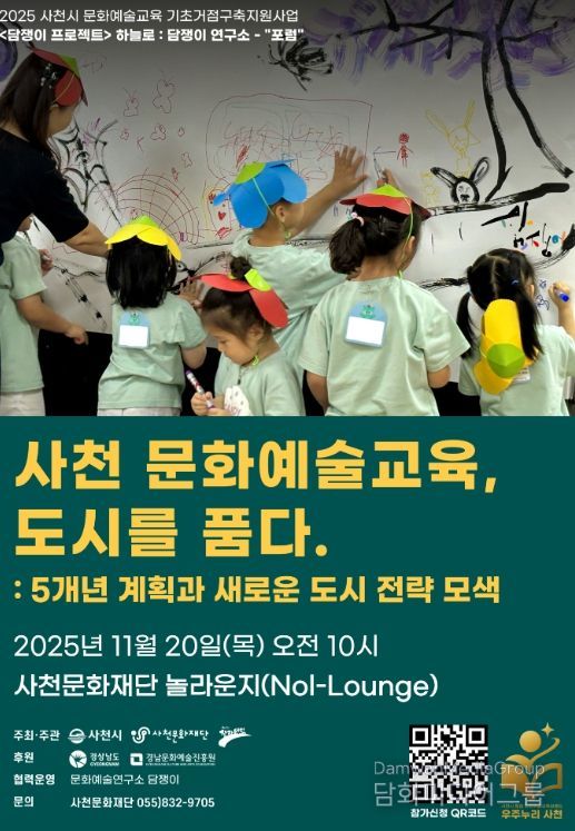 시민행정신문 강갑수 기자 | 사천문화재단이 오는 11월 20일 오전 10시, 사천문화재단 놀라운지에서 “사천 문화예술교육, 도시를 품다 : 5개년 계획과 새로운 도시 전략 모색”을 주제로 한 포럼을 통해 문화예술교육을 도시 발전의 핵심 동력으로 삼기 위한 중장기 전략을 공개한다.