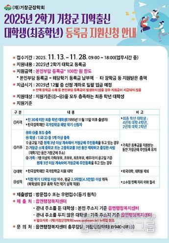 시민행정신문 강갑수 기자 | (재)거창군장학회는 오는 13일부터 28일까지 주소지 읍면 행정복지센터에서 ‘2025년 2학기 거창군 지역출신 대학생 등록금 지원사업’ 신청을 받는다.