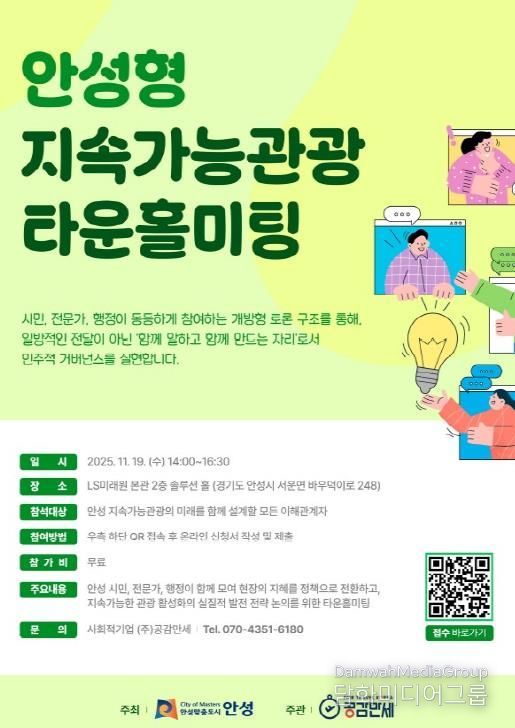 참석 대상은 안성 관광의 미래를 함께 설계할 모든 시민 누구나이며, 참여를 희망하는 시민은 포스터 내 QR코드를 통해 온라인 사전 신청이 가능하다. 자세한 사항은 운영기관인 사회적기업 ㈜공감만세에 문의하면 된다.
