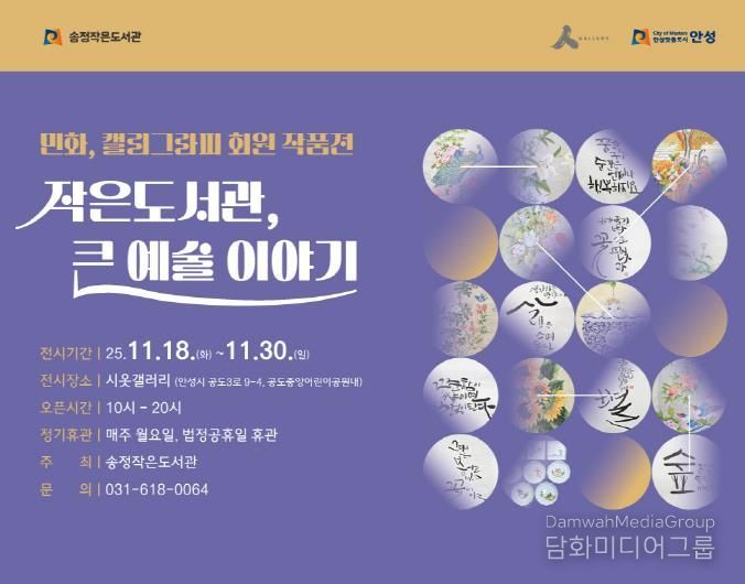 시민행정신문 기자 | 안성천 공도 작은미술관 시옷갤러리에서는 오는 11월 18일(화)부터 30일(일)까 지 송정작은도서관의 지역 주민으로 구성된 민화 캘리그라피 회원들의 작품을 모은 전시회 ‘작은도서관, 큰 예술 이야기’가 열린다.