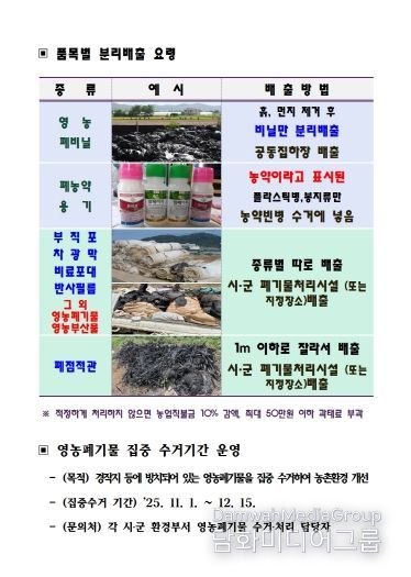 또한 영농폐기물의 올바른 분리배출 안내를 위해 마을 방송, 안내문, 현수막 등을 활용하여 적정 시기에 배출하도록 유도하고, 수거보상금 제도를 적극 홍보할 예정이다.