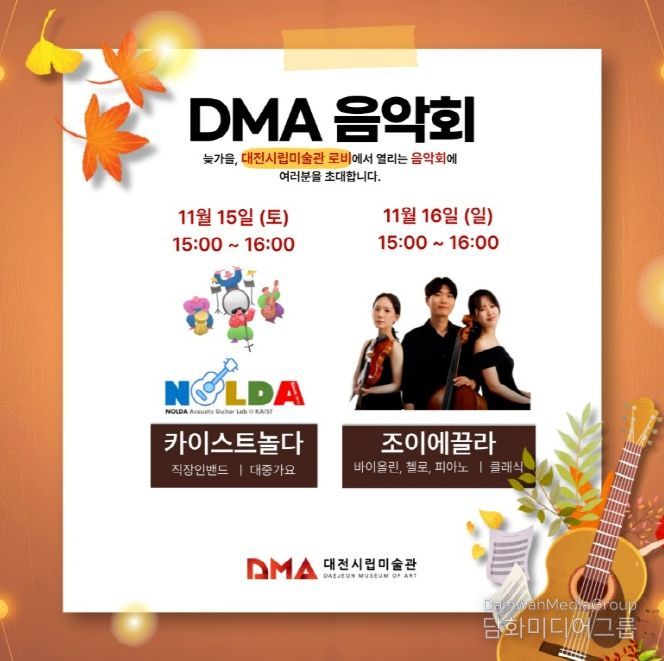시민행정신문 강갑수 기자 | 대전시립미술관은 11월과 12월, 미술관을 찾는 시민들에게 예술과 음악이 어우러진 특별한 시간을 선사하기 위해 ‘DMA 음악회’를 개최한다.