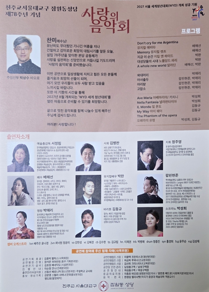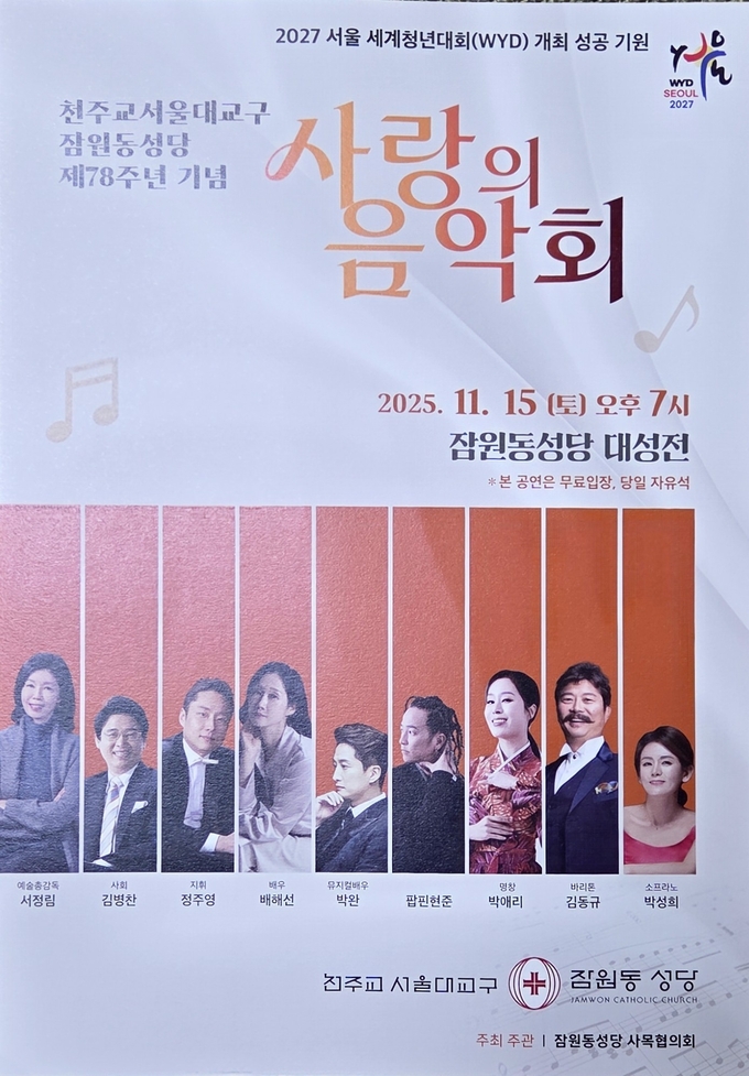 시민행정신문 김동현 기자 | 2027년 서울에서 열릴 세계청년대회(World Youth Day)의 성공적 개최를 기원하며, 천주교 서울대교구 잠원동성당 설립 78주년을 기념한 ‘사랑의 음악회’가 11월 15일 저녁 본당 대성전에서 성황리에 열린다.