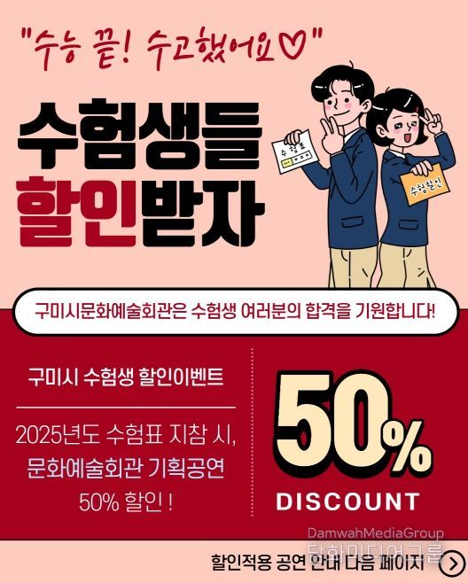 이번 특별할인 이벤트는 2025년도 수능 수험생 중 구미시민을 대상으로 하며, 본인과 동반 1인까지 50% 할인 혜택이 적용된다.