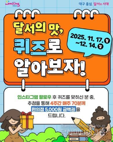 시민행정신문 강갑수 기자 | 대구 달서구는 11월 17일부터 12월 14일까지 4주간‘달서의 맛, 퀴즈로 알아보자!’ 온라인 퀴즈 이벤트를 진행한다.