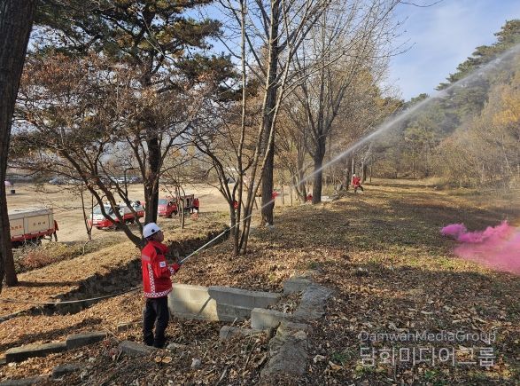 공중에서는 산불임차 헬기 1대와 드론을 활용한 소화탄을 시연해 산불 현장의 공중지원 능력을 높이는 훈련으로 이뤄졌다.