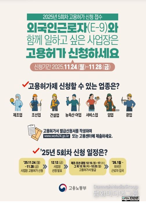 시민행정신문 이세훈 기자 | 고용노동부는 11월 24일부터 11월 28일까지 전국 지방고용노동관서를 통해 외국인근로자(E-9)에 대한 올해 5회차 신규 고용허가 신청을 받는다.